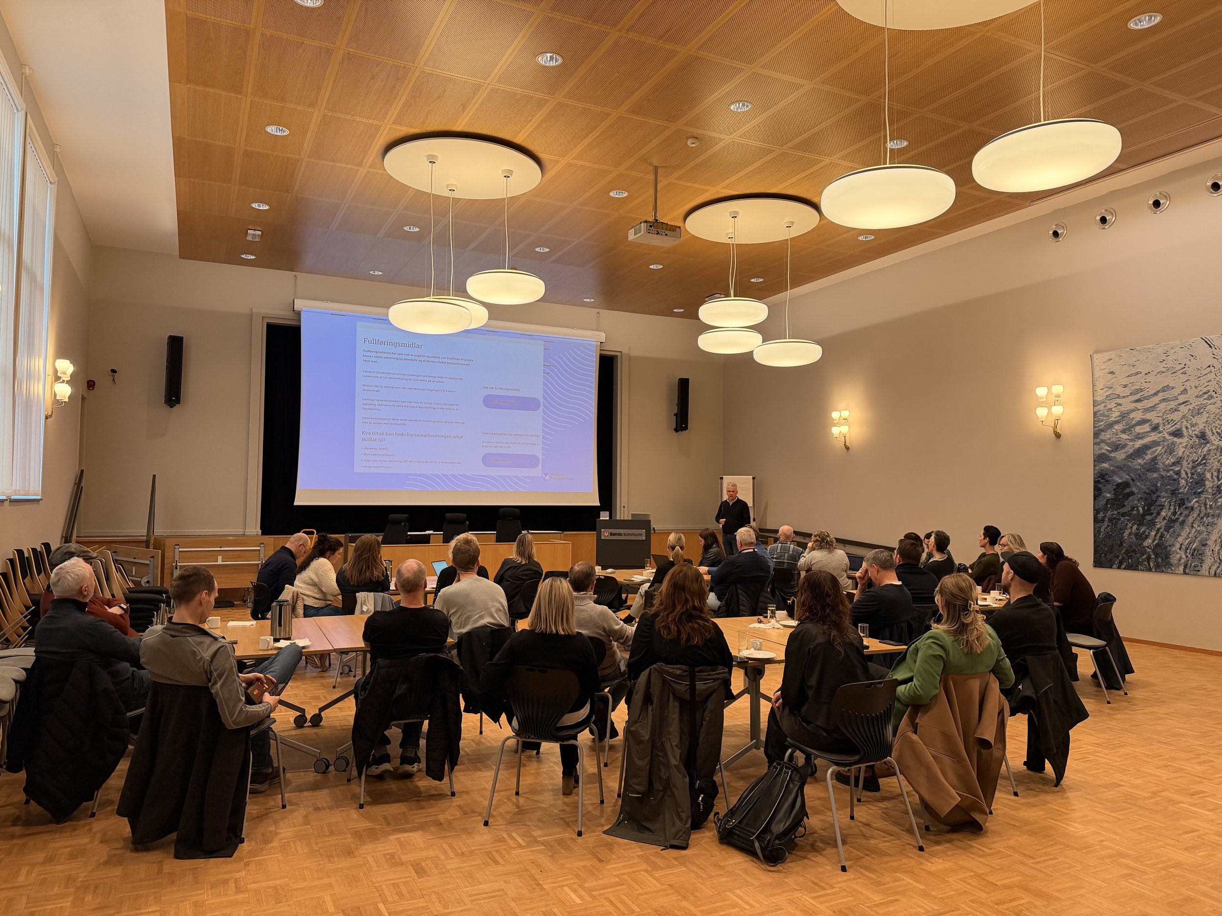 Asbjørn Mæland frå Rettleiingstenesta Vestland fortalde vidare om fylkeskommunen si rolle i fagopplæringa og korleis dei samarbeider med lærebedrifter. Han hadde fokus på kva midlar dei har til disposisjon dersom det er behov for ekstra oppfølging av lærlingar eller behov for styrking i oppstarten, og kvar desse midlane overlappar eller blir brukt saman med NAV sine midlar.