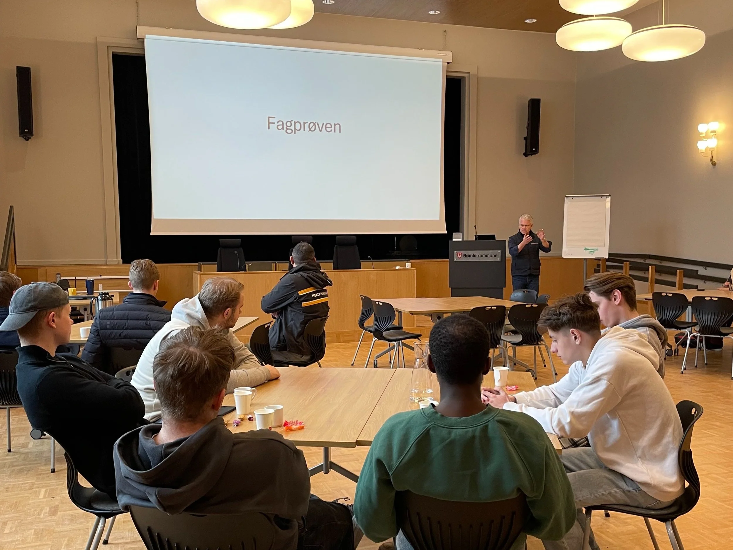 Deretter tok Asbjørn Mæland frå Rettleiingstenesta over og forklarte det formelle rundt fagprøven: Kva må vera på plass i forkant, kva som blir rekna som juks, og kva ein gjer dersom ein får karakteren "ikkje bestått".