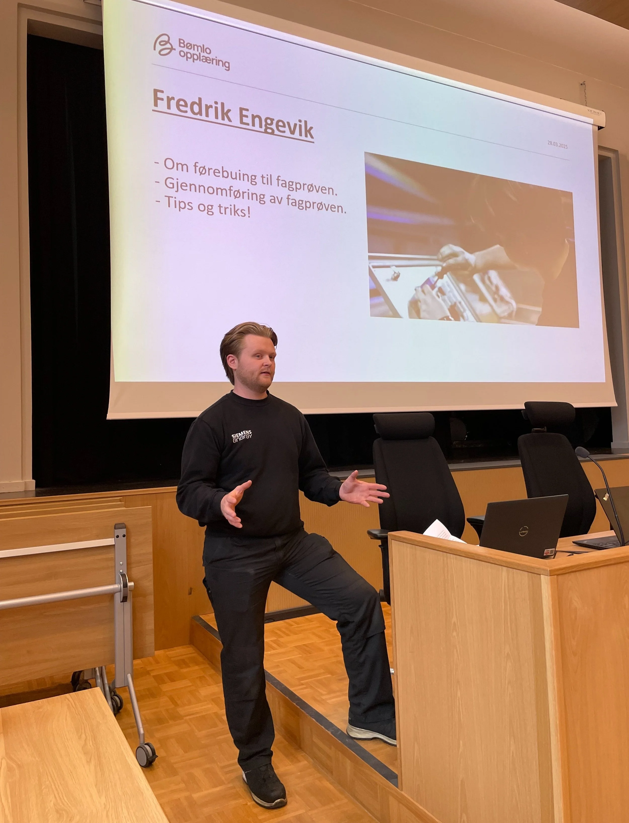 Fredrik Engevik, som deltok på fjorårets fagprøvesamling og no er utdanna automatiker, delte si eiga erfaring med fagprøven. Han fortalde korleis han førebur seg, korleis sjølve prøven gjekk føre seg, og kom med gode tips og triks til korleis ein kan stå best mogleg rusta.